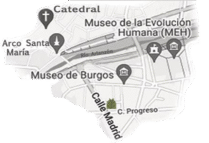 Calle Madrid, nº 11, junto a la salida de la estación de autobuses, muy cerca de la Plaza de Vega, y en la intersección de la calle Concepción, y calle Progreso. Ubicada en una de la principales arterias de la ciudad, y de comunicación entre las dos márgenes del rio Arlanzón.